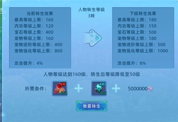 3、转生完成后,等级会降至50级,后续通过完成任务获取经验时,将触发此前储存的经验返还机制,等级会快速提升,让你重新回到巅峰状态。