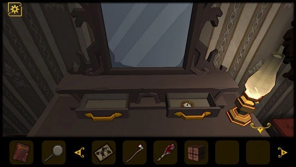 9、从镜子下方的抽屉里取出手表,点击之前得到的魔方道具,再点击搜索按钮,把墙上的小魔方拼成和获得的魔方相同的样子,就能解开谜题拿到宝石道具了。