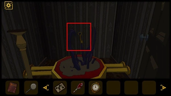 4、在留声机的背后获得房门钥匙,打开房门去往下一个房间,入眼即可看到一个钟表,绿色指针指向V