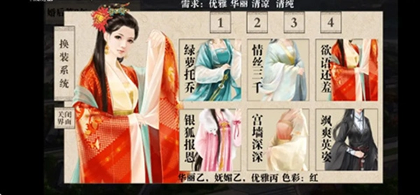 -第三步,按照触发条件去攻略对应的人物,剩下的时间里每天去巧手坊绣嫁衣,随便敷衍绣一下就行(这样能节省回合数,也就是节省时间和活动次数),绣好的嫁衣送给他人还能增加好感度(送给家人加30点,送给闺蜜和好友加10点)。这么做的目的是为了在第三年获得衣服。