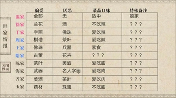 -世家方面:举办/参加宴会就好,有耐心就按表来,没空就只办宴会,荤素搭配,口味适中,重金花钱就完了。