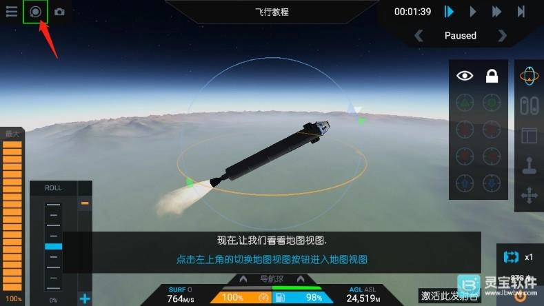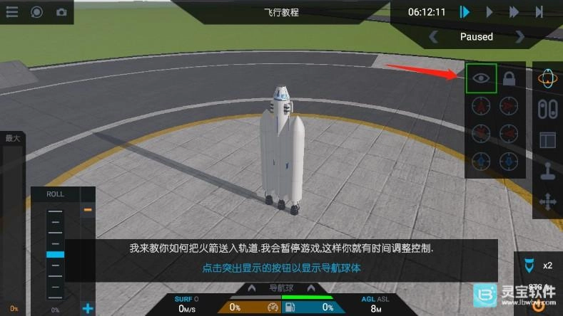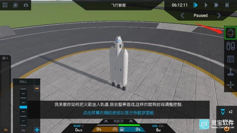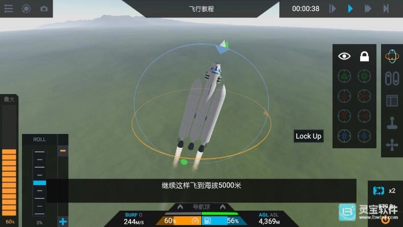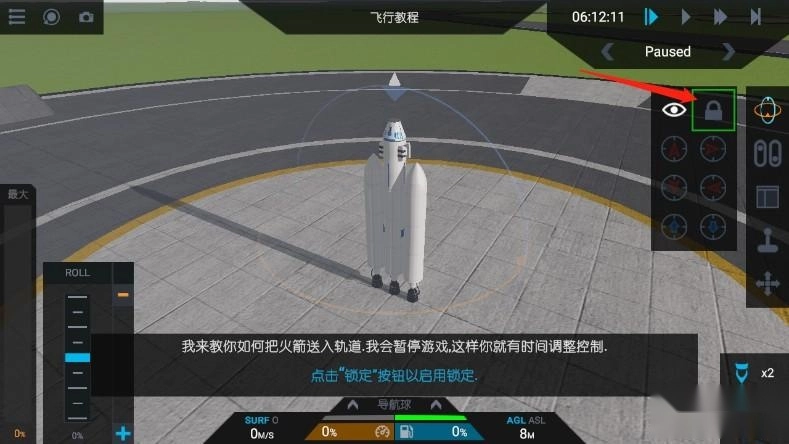 4、接着点击锁定按钮;导航球体用于控制火箭的航向,启用该按钮后,火箭会持续尝试朝向蓝色三角形的方向,白色圆锥体则代表火箭当前的指向。