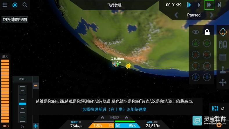 4、飞行过程有实时数据面板,燃料剩余、速度、轨道参数等信息直观展示