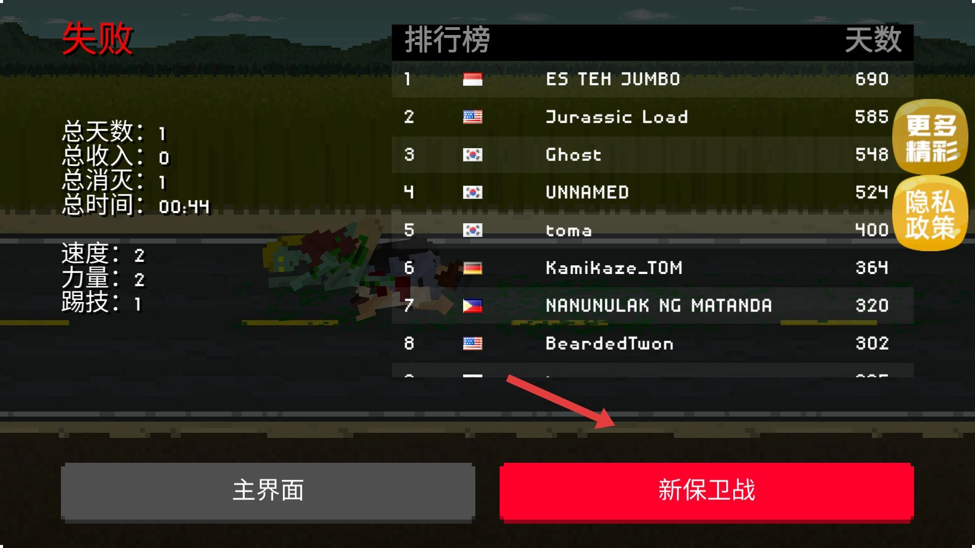4、战斗结束,无论胜负,可返回主界面,或再次开启新保卫战,尝试突破生存天数与消灭数量。