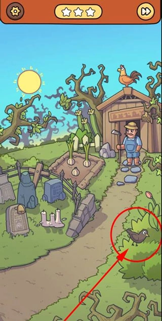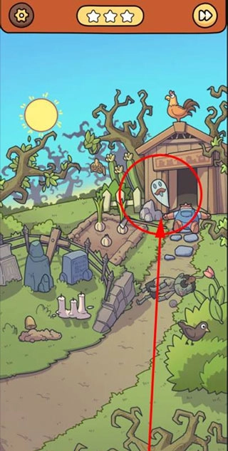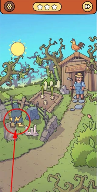 脑洞大侦探通关指南 1. 小屋门前菜园旁立着一块挂有铃铛的墓碑,点击墓碑上的铃铛,会浮现闪电标识,点击该标识即可将其收起。