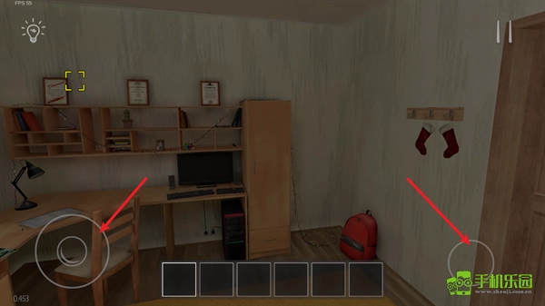 进入后,你会出现在自己的房间里。通过左侧的虚拟摇杆能操控角色移动,右侧的按钮可以完成“起立”或者“下蹲”的动作,这样方便躲避他人视线,也能穿过低矮的空间。