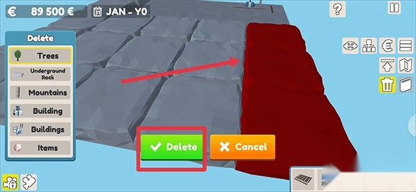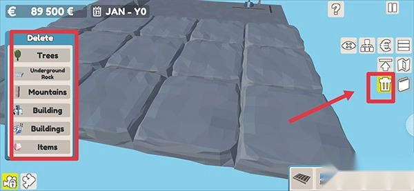 2、每一种矿石和液体表面都覆盖着石头,若想开始采矿,需先移除这些石头;而要移除石头或树木,可点击垃圾桶按钮,接着在删除选择器里点击对应的物体,就能将其删除。
