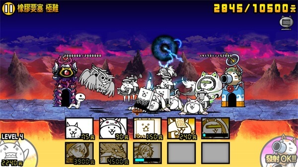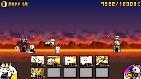 大概升到五级就差不多了,你可以学我这样操作:打掉第一只狂牛后先不派任何猫,等狂牛靠近我方塔时再集中派猫——这样既能攒钱,又能省掉从派出到前线的支援时间,还能让火力更集中,集中量产输出型猫咪。