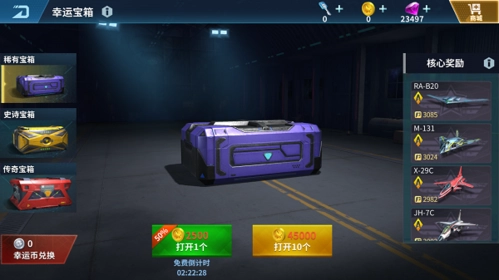 越高级的幸运宝箱,有几率获得的飞机品质就越高,单抽有几率获得以上奖励之一,十连抽则有几率获得以上奖励10个。使用金币就能打开稀有宝箱,还有几率抽到一些只能钻石获得的道具,总的来说还是挺划算的。