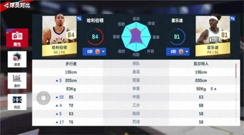 可以看到哈利伯顿在进攻方面强一点,霍乐迪防守面要强一点。其实但从进攻数值来说,哈利伯顿和一些紫卡不相上下了,我们下面来看下哈利伯顿的进攻属性。