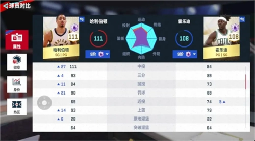 1、后卫线推荐两个球员,哈利伯顿和霍乐迪,两个球员风格不相同,但都是金卡里后卫比较强的,首先我们来看两个球员的能力对比: