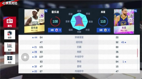 2、接着是霍乐迪,这个球员是属于典型的防守大于进攻,可以看到九阶霍乐迪的各项防守数值都比较恐怖,大家需要注意的是外线防守这个点,其实目前大部分得分后卫的进攻方式都是外投或者快攻,而霍乐迪极其克制这两种得分方式。