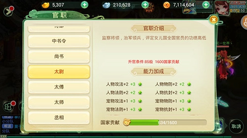 每个官职都有修炼技能的加成,官职越高,加成越高。