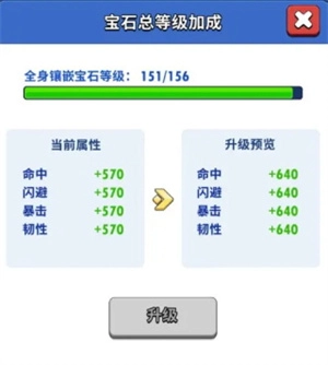 宝石镶嵌总等级是所有装备镶嵌宝石之和,达到要求后可给角色提升命中、闪避、暴击、韧性的四个基础属性,等级越高增加的属性越多。