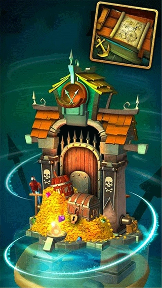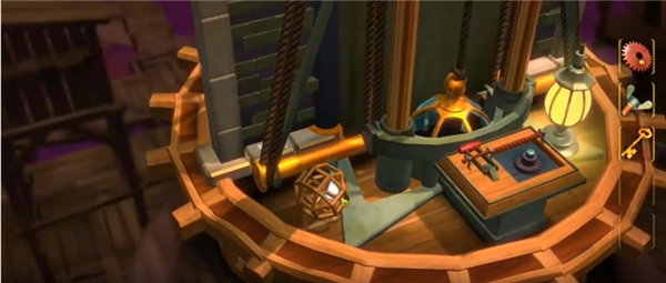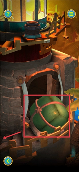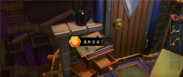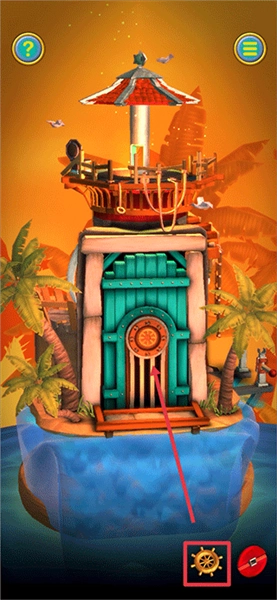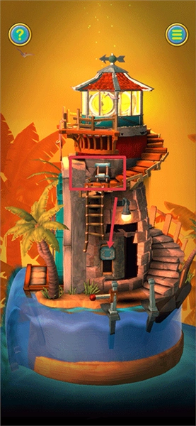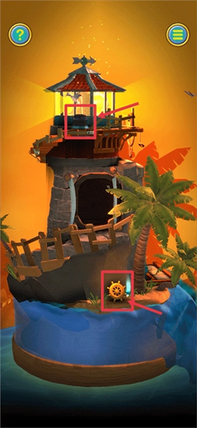 2、触发第二段教程后,先返回缩小画面,将灯塔转动到下图的角度,上方的盒子可划动打开获取【红宝石】,下方可获取【船轮】和【蓝宝石】