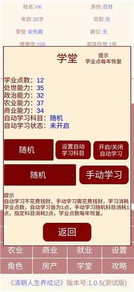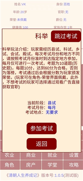 参加考试:从童生->秀才->举人->进士一路考上去。每次考试都需要一定的智力属性,考试成功会获得“功名”和官职。