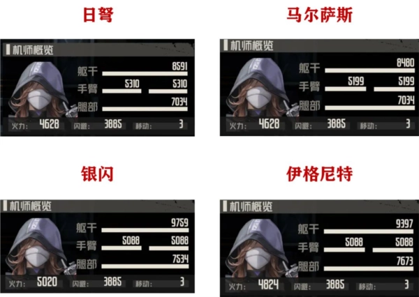 首先我们来简单看下这四个机兵的基础属性,其实作为开服机兵的日弩和开服后1个月左右就上线的马尔萨斯,这两个机兵的属性自然就该是最低的......没啥悬念,而接着银闪的属性倒是颇为不俗,但是.......诶,这个但是咱们还是留着待会再说,最后的伊格尼特作为和日弩的差距并非达到质变级别的新导弹机兵,也有一些可聊的东西,接着咱们即进入单个分析环节。