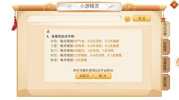 1点敏捷对应1.5点速度,1点体格可增加8点气血、0.6点法防与0.2点速度,1点力量能提升1点物攻、0.4点法防和0.2点速度,1点耐性则带来2.2点物防、0.4点法防及0.2点速度。