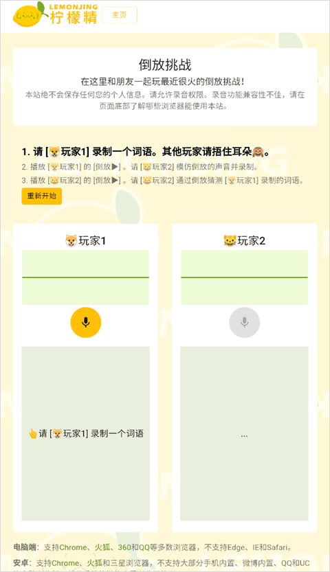 是玩家1先录一段声音,其他玩家得通过倒放后的音频猜出对应的词语。快喊上好朋友们一起玩这个有趣的挑战吧!