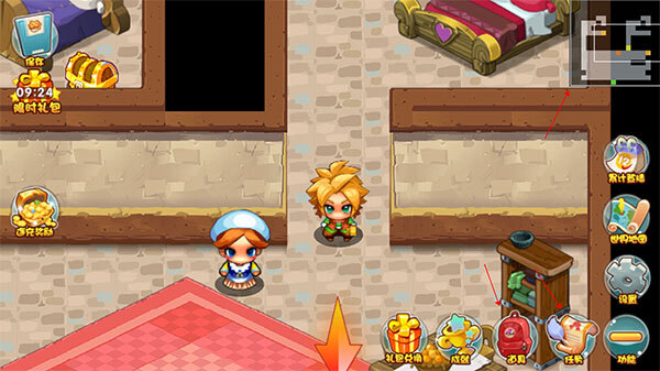 1、首页左上角可以“保存”可以存档进度,点击地板,就可以操纵角色移动到指定位置,右下角点开,可以看到设置等菜单键。