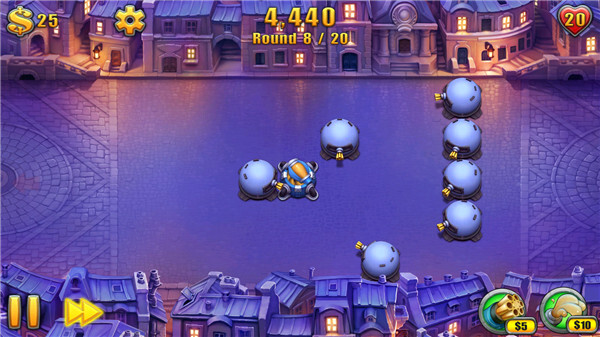 界面空间十分开阔,玩家可以自由规划建造布局,而如何设计出能让敌人行进路线更长、承受更多打击的路径,就需要考验大家的战术策略能力了。防御塔设有3个等级的提升空间,升级后能增强塔的战斗性能,其升级机制与其他塔防类游戏大致相同。