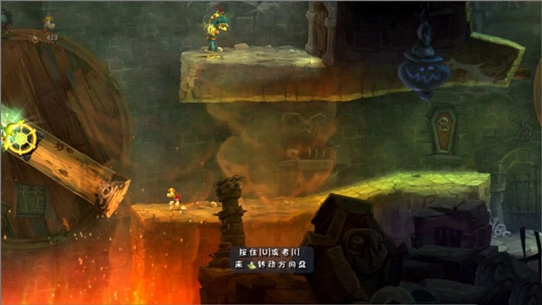 6、要注意先跳到铁环上,接着转动圆盘,等人物到了最顶端再放手,这样就能跳下并抓住中间的铁环。这时候再把圆盘转到水平状态,就能跳出去解救精灵了。