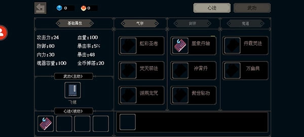 13、【天赋的升级】每次通关以及开启新区域后,左手边的位置对应的是武功升级功能,右手边则是天赋升级功能(需要通过点击对话来触发)。
