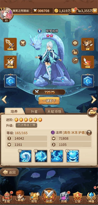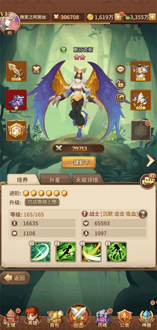 点评:这个英雄他的前期是非常强的,差不多第二轮就可以结束战斗,到后期的单体伤害也是很高的,并且她有两个主动技能和两个被动技能。建议前期优先培养,人物搭配(前期清一色橙色武器装备,后期3到4星红色武器装备)阵容建议放在后方输出。