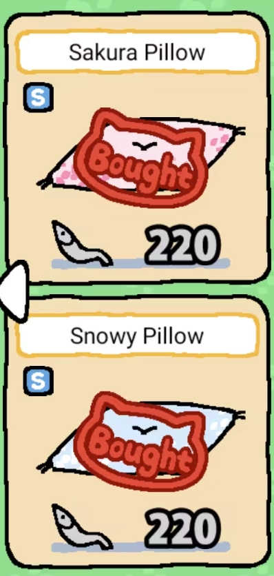 【S-1猫使用】这两个垫子放了,我每次进看,几乎都是有猫在上面!但是给金鱼机率不是特别高。樱花垫子可吸到特殊猫-武士猫,雪花垫子可吸到特殊猫-雪猫。