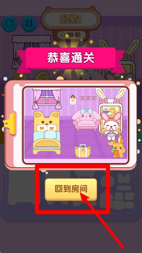 3.通关提示清晰明了:完成拼贴任务后会显示“恭喜通关”的提示,点击“回到房间”按钮就能快速返回,整个操作过程流畅且直观。