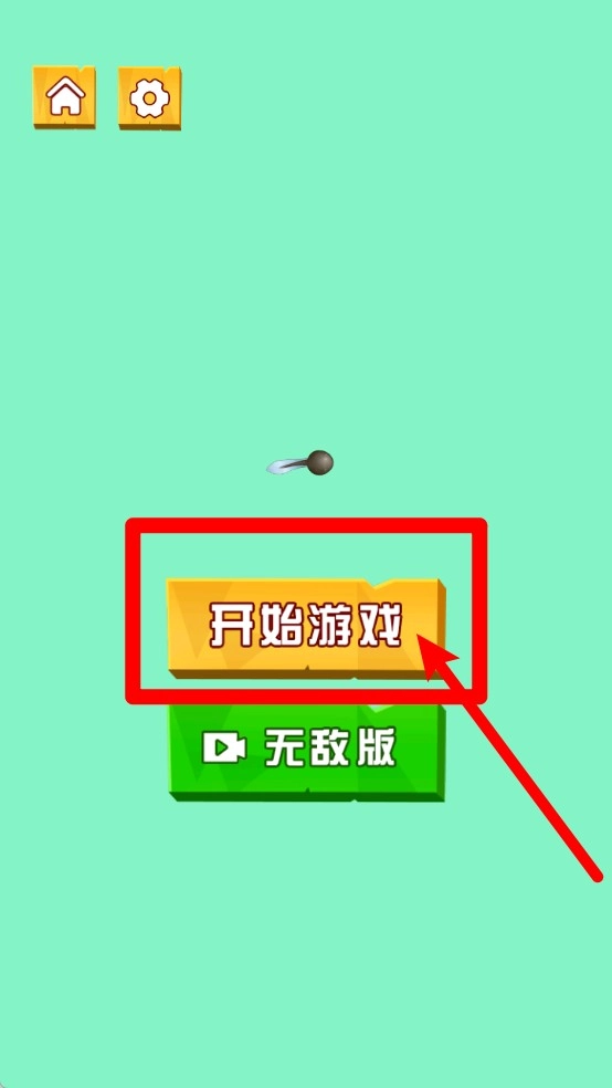 1.主菜单界面:点击开始进入关卡,亦可选择无敌版体验,左上角房屋与齿轮用于返回主页与设置。