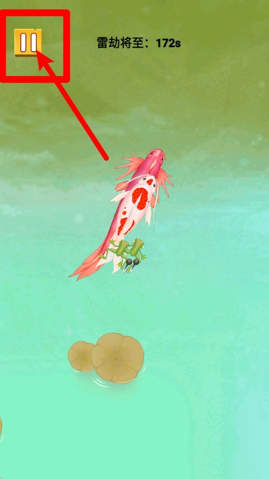 2.作战提示界面:左上角暂停键可暂离,雷劫倒计时显示剩余时间,操控小鱼避强就弱并优先吞噬小体目标。