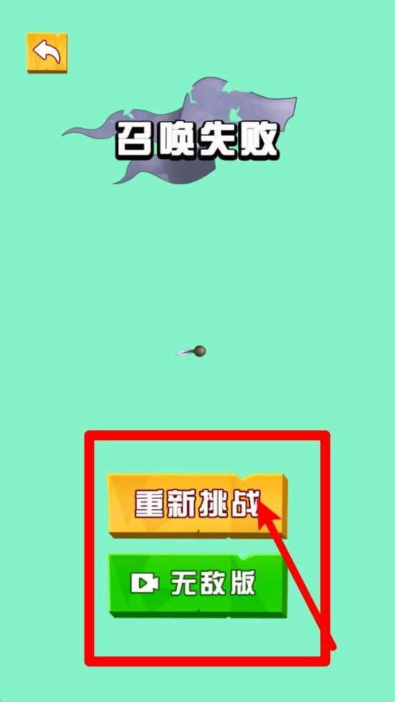 3.召唤失败界面:点击重新挑战可立即重开关卡,或观看视频进入无敌版,建议复盘走位与道具使用节奏。