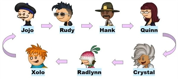 *按照“最后一位顾客(closer)”顺序表(如下图)确定二人到来的日子,到达该天后先暂停进入顾客信息界面,查看该顾客的点单内容,然后一开始就把面包炸好,等到接下第六位顾客的订单后马上制作,制作完再接单然后马上提交,此流程可以达成成就。