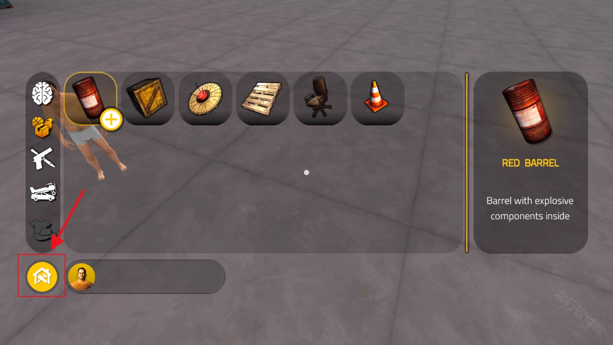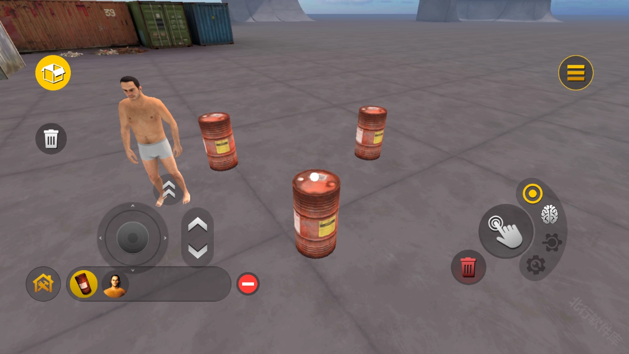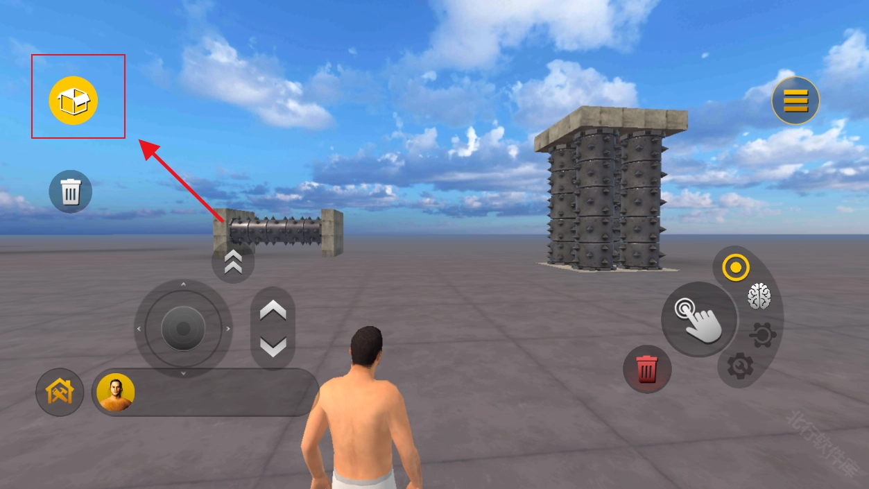 5、选择道具栏中你要放置的物品,点击右侧的【手指】按钮,可以将其放置在沙盒中。将准心对准要删除的道具,点击【垃圾桶】图标则可以将其删除。利用好添加、删除功能,玩家就可以创造自己的沙盒世界了