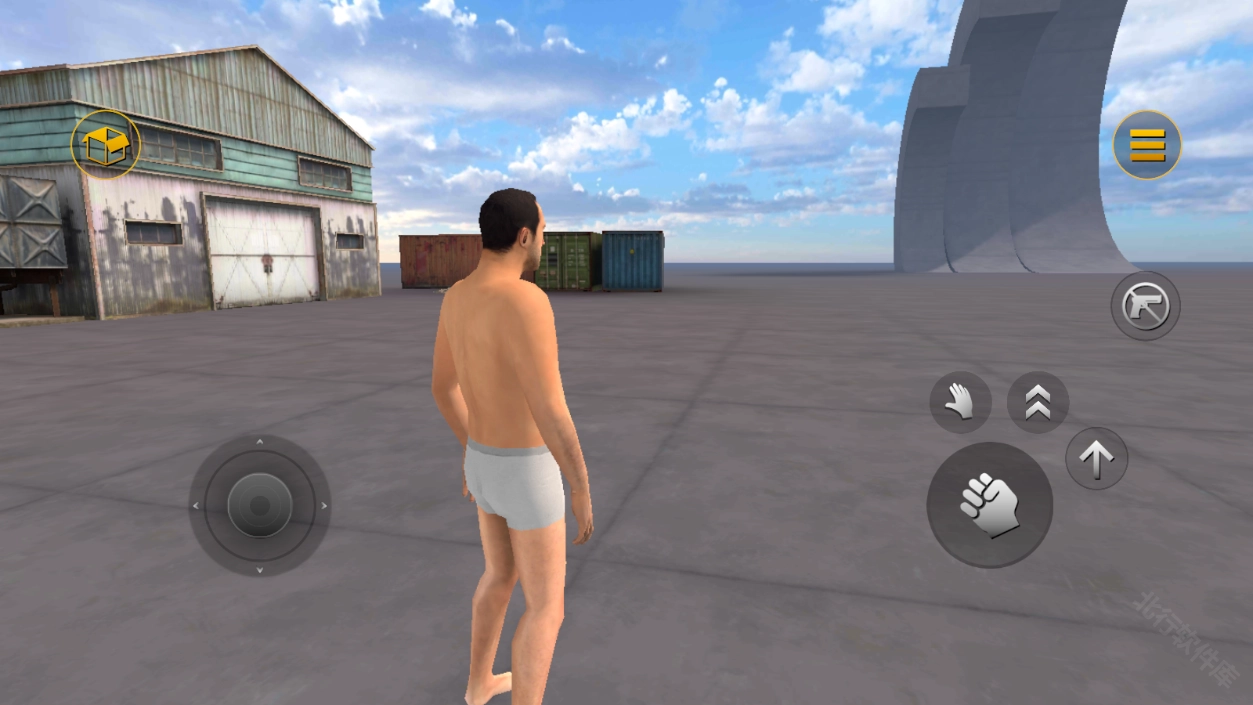 2、玩家可以操控沙盒创造者,滑动左侧遥杆控制人物移动,右侧分别是出拳、互动、飞行和加速,点击手枪图标可以使用激光眼
