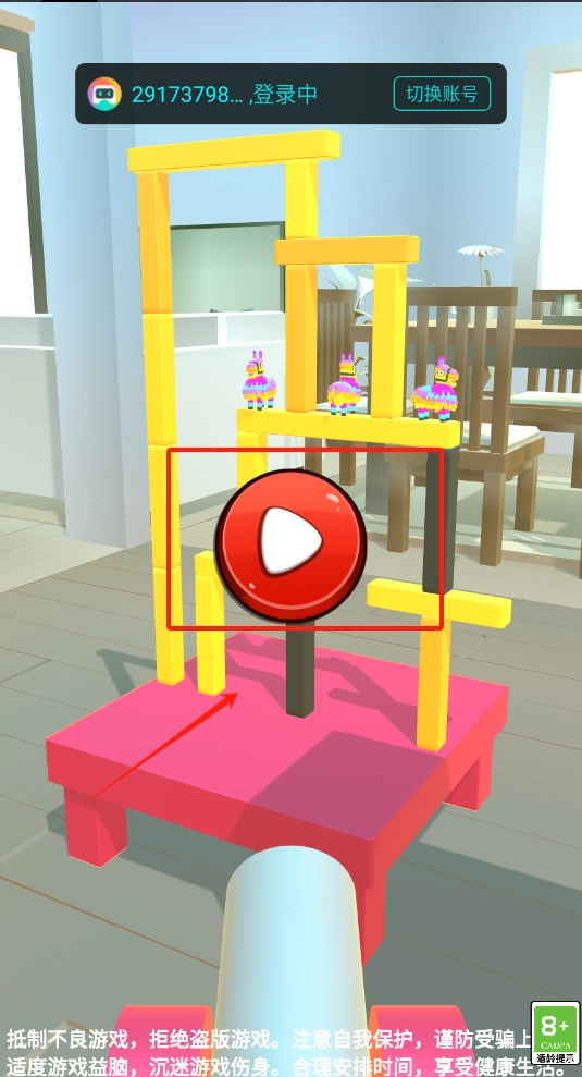 2、点击红色圆形按钮启动,看到黄色积木塔和小马玩具。