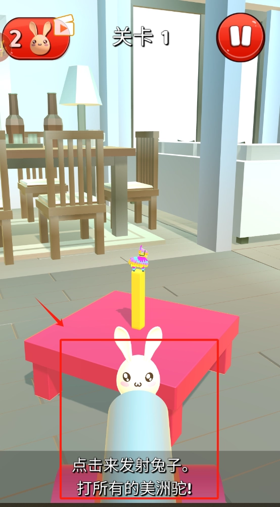 3、点击下方发射按钮,操控白色兔子射击消灭所有美洲驼。