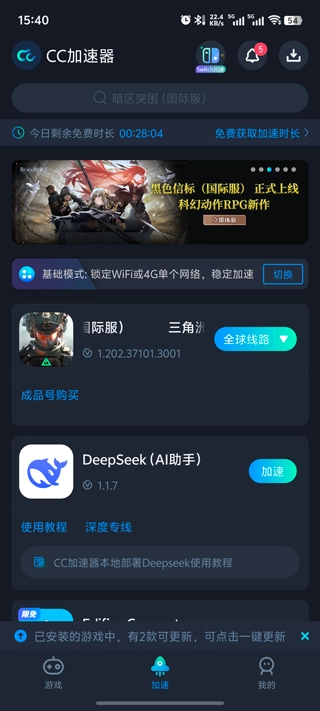 1、首先打开三角洲行动国际服,完成后启动加速器(比如CC加速器、奇游加速器),找到该游戏,点击加速;