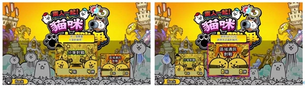 在对战模式中,画面上方有战力计,先将对手的战力计降至零者胜利。击破对手的猫咪并攻击对方城堡,就能减弱对方的战力数值。