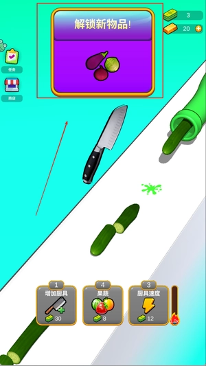 2、使用赚取的金币购买新厨具或升级现有工具,提升切割流畅度与效率,迎接更难的任务挑战。