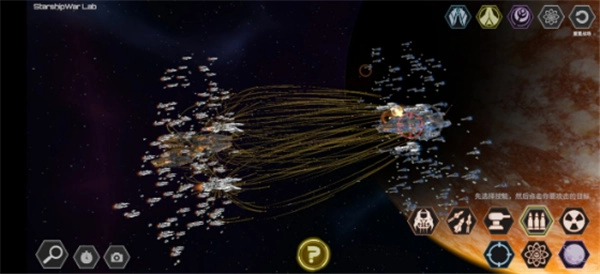 6、上面右边五个依次为:操控蓝方战舰、操控黄方战舰、操控水滴、选择战舰数量及自动开火密度、重置战场。