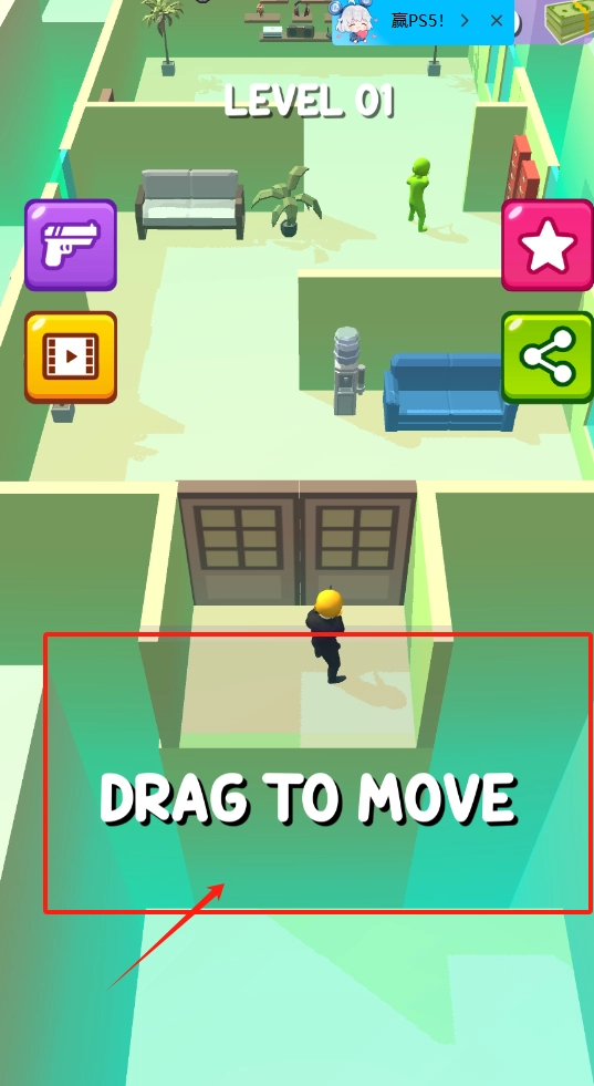 1、戴着黄色头盔的小人站在房间门口,左上角的紫色枪形图标能用来射击,右上角的星星图标或许是奖励机制。通过拖动屏幕可以调整视角,游戏目标是消灭敌人以赢得PS5。
