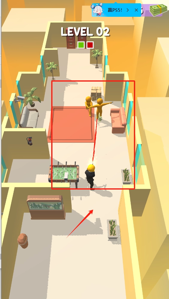 3、对面两个黄衣人在指红色危险区域。红色箭头提示攻击方向,需瞄准红框区域射击。右上角依然有PS5奖励图标,需击败敌人通关。
