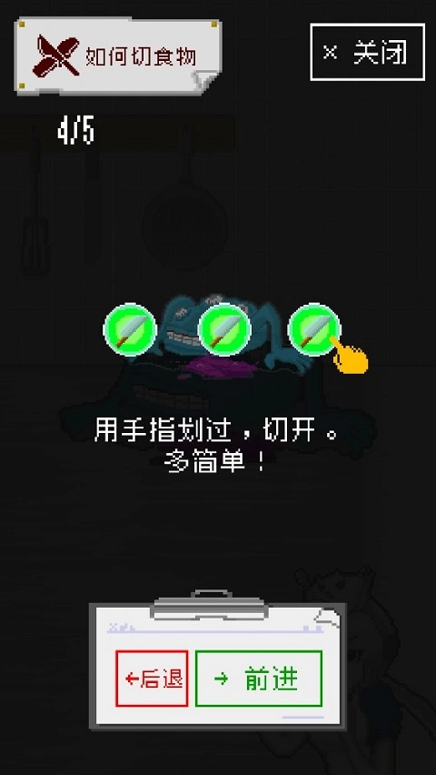 具体的玩法有些类似玩家熟悉的《水果忍者》,绿色圆圈图标会以不同的角度,进行位置调换和旋转,尽可能的一刀切,能快速将食物切开,切碎。
