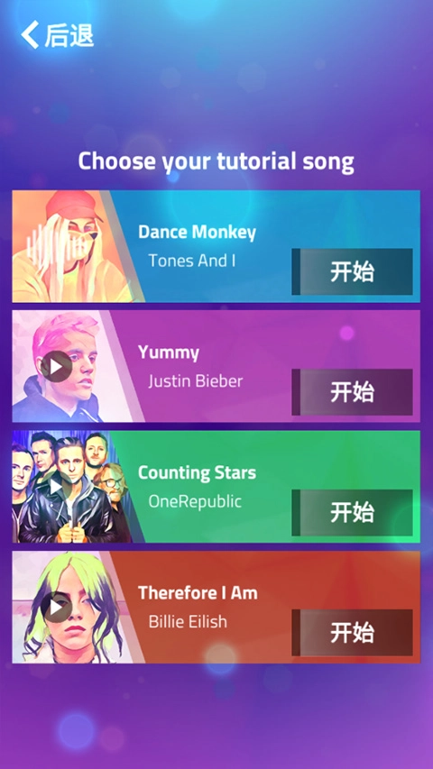 1、玩家进入后,最先迎来的是教程阶段。这一阶段通常比较容易通过,通过教程后,玩家便会有更多歌曲可供选择,其中不乏许多中文热门歌曲。