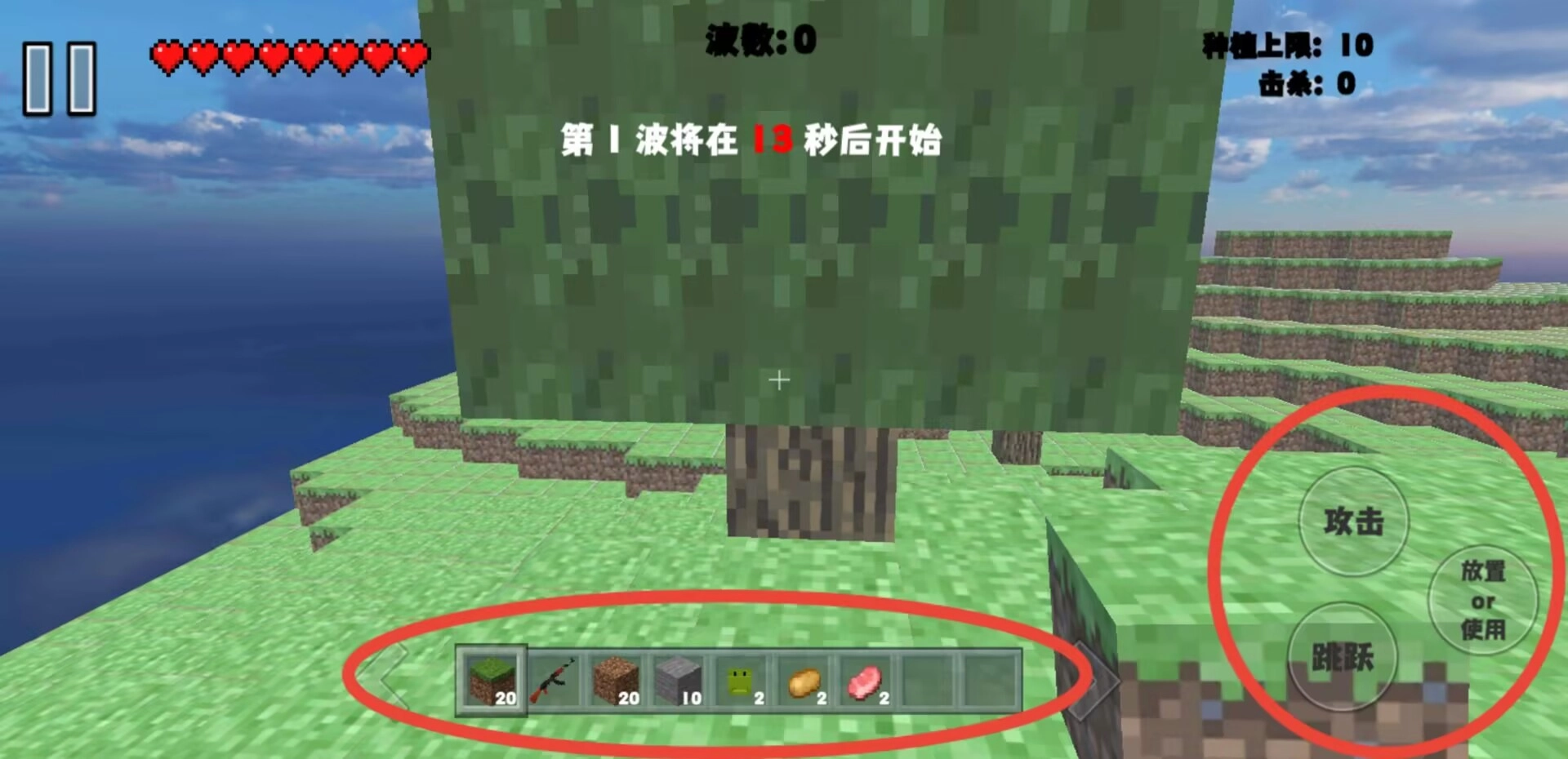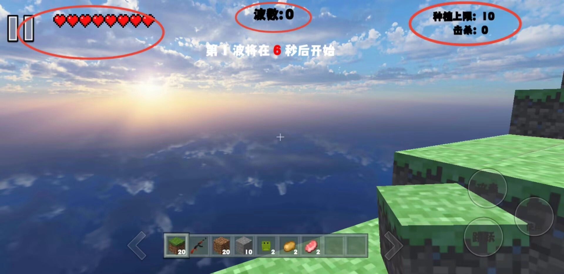 2、界面左上角显示角色生命值与暂停功能,顶部中央标注当前攻防波次,右上角统计资源上限与实时战绩数据。