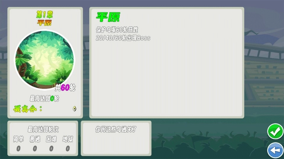 2、选择从第一章开始,会出现章节的相关信息,如保护鸟蛋60轮获胜,20/40/60轮会出现boss。