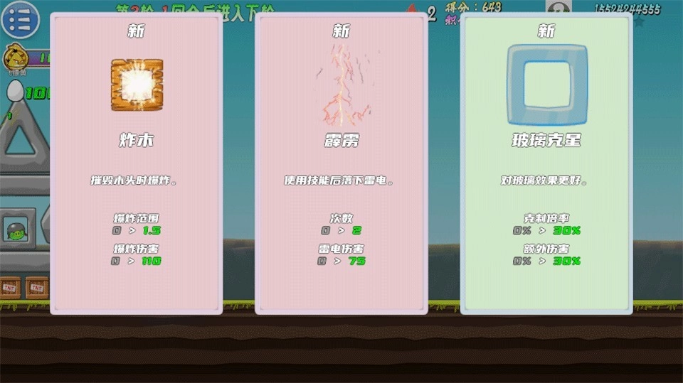 需要玩家选择适合的buff增强小鸟,后续挑战会越来越难需要合适的buff破局。