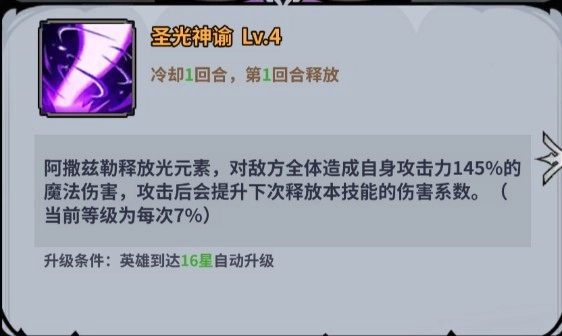 阿撒兹勒释放光元素,对敌方全体造成自身攻击力145%的魔法伤害,攻击后会提升下次释放本技能的伤害系数。(当前等级为每次7%)